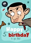 Cute, brightly coloured, illustrated card of Mr Bean and Teddy with multiple styles of fonts on a blue background