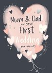 A sweet and whimsical greeting card with a large pink heart-shaped balloon at the centre, surrounded by floating hearts, sparkles, and stars, set on a dark navy background to celebrate a first wedding anniversary.