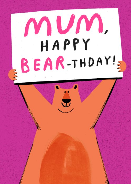 A cheerful, fun birthday card featuring a smiling illustrated bear holding a white sign against a bold pink background. The card uses a clever bear-themed birthday pun making it a light-hearted and fun choice for Mum.