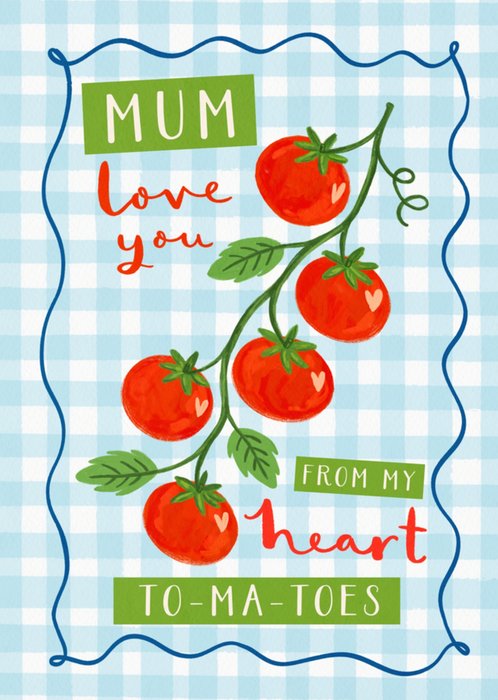 A humorous design featuring an illustrated vine of red tomatoes with green leaves and a hand-drawn wavy border on a blue and white gingham background.