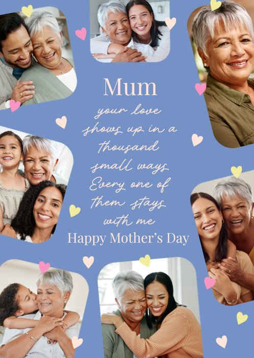 Featuring a Mother’s Day greeting card with seven rounded-corner photo frames around the edges, small pastel heart icons, and a large message in the centre on a blue background.
