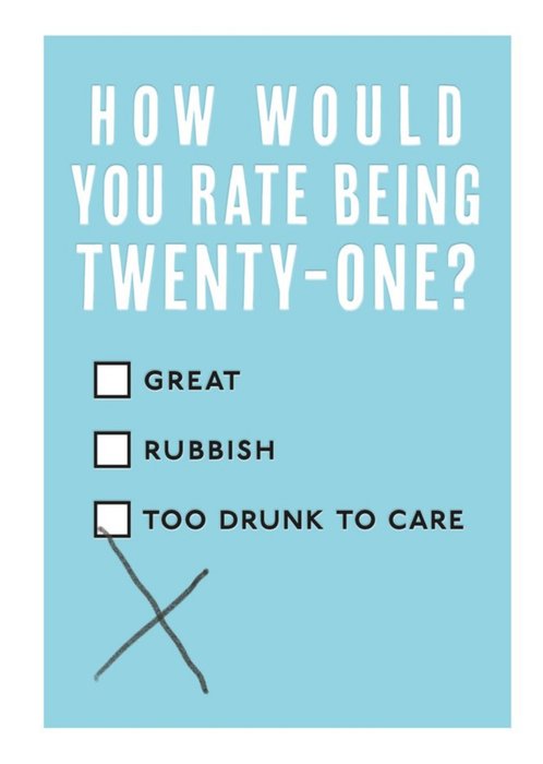 Front of card: Bold typography with checkboxes on a blue background. Text reads: "HOW WOULD YOU RATE BEING TWENTY-ONE? GREAT. RUBBISH. TOO DRUNK TO CARE."
