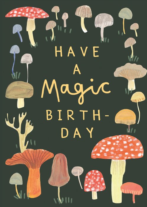 Featuring cute illustrations of various mushrooms around the edge of the card with yellow typography in the centre, all on a black background.