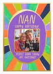 Featuring a vibrant, sun burst effect striped background in shades of blue, green, orange purple and yellow. At the centre, there's an oval frame with a gold border. Inside the oval, there is one photo upload area and the typography in a gold foil effect.