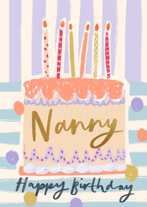 A charming and joyful birthday card for a nanny featuring a beautifully illustrated birthday cake with candles. The design includes gold lettering, pastel-striped background, and colourful confetti-style dots, creating a warm and celebratory feel.