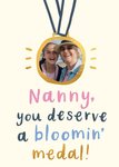 Features a circular photo upload at the top of the card in the shape of a medal with a gold frame. Below the medal is text in a hand written style font in a mix of blue, pink and gold.