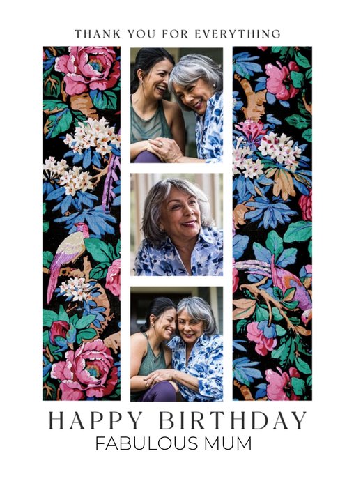Front of card: Natural History Museum Mum's Photo Upload Birthday Card Three photo frames one with flowers on a pink background. Text reads: "You're a mum in a million happy birthday".