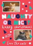 Front of card: Features two photo uploads with large multicoloured typography in the centre of the card on a red background. Text reads: "Naughty Or Nice Happy Christmas Love The Cats"