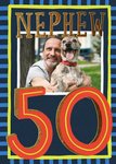 Front of card: Featuring colourful, hand-painted effect typography with one rectangular photo upload frame. The card is adorned with decorative painted stripes in various colours against a dark blue background embellished by diagonal teal stripes. There is a big number 50 in the centre with a gold foil 3D text embellishment. It’s a personalised card celebrating a Nephew's 50th Birthday with enthusiasm and admiration.
