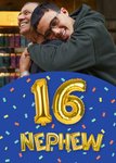 A modern, fun design featuring a large photo upload area with gold balloons underneath arranged into a '16 Nephew' message. The text is surrounded by colourful confetti, and has a dark blue background.