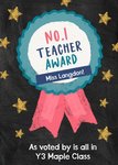 Features an illustration of a rossette surrounded by stars. Text reads "No.1 teacher award Miss Langtdon! As voted by us all in y3 Mapel Class".