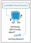 Front of card: Nothing Artificial About Your Intelligence! Congratulations Card Humorous illustration of a computer bot. Text reads: "Congratulations! Nothing artificial about your intelligence!".