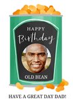 Okey Dokey Illustrated can of baked beans. Personalised photo upload option. The caption reads Happy Birthday Old Bean. Have A Great Day Dad! With the option to personalise the words Old Bean and Have A Great Day Dad!