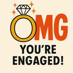 Featuring a cream greeting card with a large yellow engagement ring and sparkling diamond beside bold block letters in orange and black in the centre.