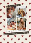 Front of card: A romantic design featuring four photo frames in a grid-style collage with handwritten banners on a red & cream heart pattern background.