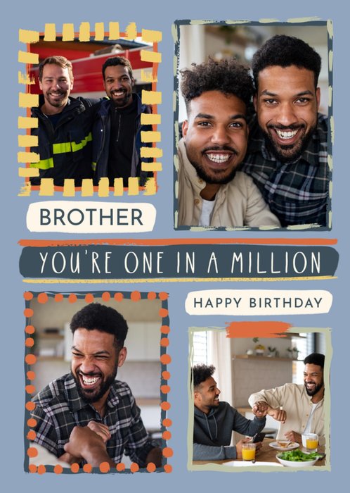 Featuring four rectangular photo upload frames with sketchy painted borders in mustard yellow, navy and orange, arranged around bold panels of text on a soft blue background with distressed painted accents.
