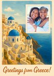 A sunny painted illustration of Santorini’s iconic white-washed, blue-domed rooftops cascading down a cliffside towards the Aegean Sea. There is a frame for your own photo in the top-right, and the handwritten line at the bottom.