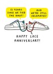 Front of card: Solemates! 13th Anniversary Funny Pun Card Cartoon Illustration of a pair of trainers tied togethers. Text reads: "13 years since we tied the knot! And we're still Solemates!" and "Happy lace anniversary!"