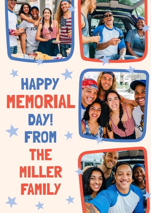 Featuring four photo frames, two blue and two red with stars scattered around the design. The text uses a fun and bold font.