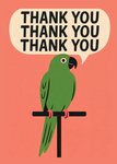 Featuring a colourful illustration of a parrot with a speech bubble above containing a repeated 'Thank You' message. The design sits on a coral pink background.