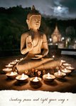 A serene and spiritual Vesak greeting card featuring a beautiful image of a Buddha statue surrounded by glowing candlelight under a moonlit sky. The card carries a peaceful and heartfelt message, perfect for sending blessings, light, and tranquillity to loved ones on this sacred occasion.