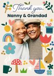 Front of card: Thank You Photo Upload Card Photo frame surrounded by various spot illustrations. Text reads: "Thank you Nanny & Grandad". 'Nanny & Grandad' can be personalised!