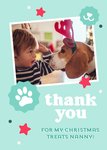Front of card: From The Dog Photo Upload Christmas Card Photo frame with dog themed icons on a teal background. Text reads: "Thank you for my christmas treats Nanny!". 'For my christmas treats Nanny!' can be personalised!