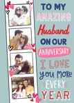 Front of card: 'To my amazing Husband' Photo Upload Anniversary Card Photo strip with hearts and various typography. Text reads: "To my amazing husband on our anniversary I love you more every year".