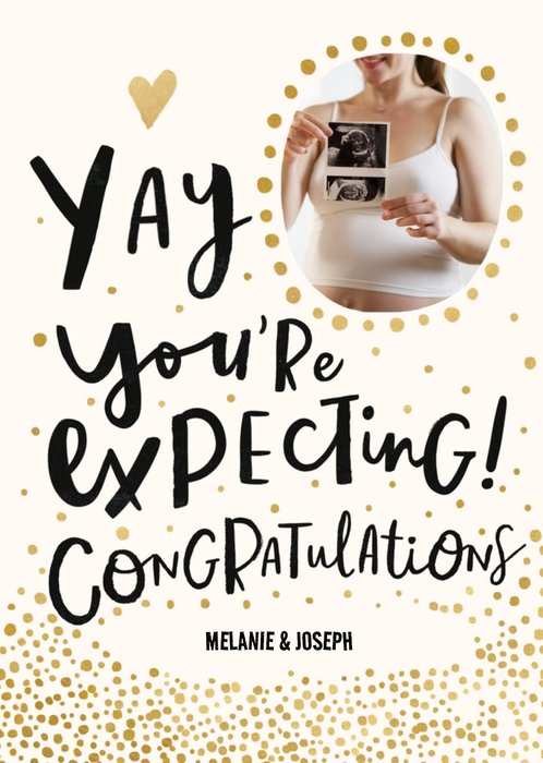 Front of card: Photo upload area at top of card with large handwritten black text with editable names on a cream and gold coloured spotty patterned background. Text reads:"Yay you’re expecting! Congratulations Melanie and Joseph" With customisable name.