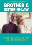 Front of card: Large photo upload area in central third of card with large white brother & sister-in-law text and humorous yellow anniversary message above and below all on a teal background. Text reads:"Happy anniversary brother & sister-in-law. Kudos for putting up with each other this long!." With customisable Happy Anniversary and message.br> Back of card: Pigment logo. Moonpig logo.