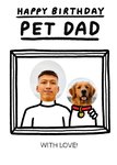 Front of card: Black and white doodle of a man's body with it's arm around a dog. Both the head of the man and dog are photo uploads for your own personalisation. Text reads: "Happy Birthday Pet Dad With Love". 'With Love' can be customised. Back of card: Pigment logo. Moonpig logo.