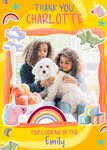 Front of card: Photo Upload Thank You Card Picture frame surrounded by child themed spot illustrations. Text reads: "Thank you Charlotte for looking after Emily". All text can be personalised!