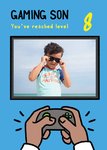 Front of card: 8th Birthday Card Illustration of an Xbox gamer with photo upload and text. Text reads: "Gaming son. You've reached you're level 8". Editable age.