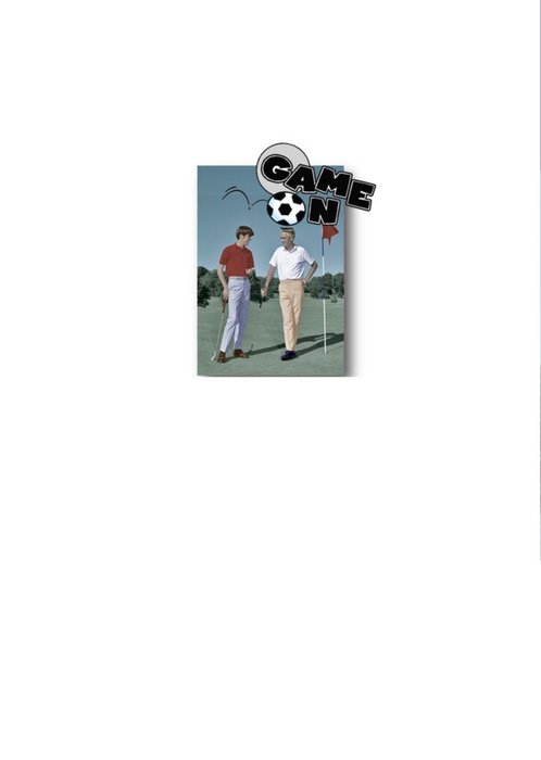 Photo of two men playing golf with text above