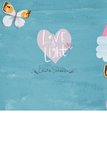 Featuring a colourful rainbow above hand lettered text, with butterflies, flowers, leaves and small heart icons on a blue background