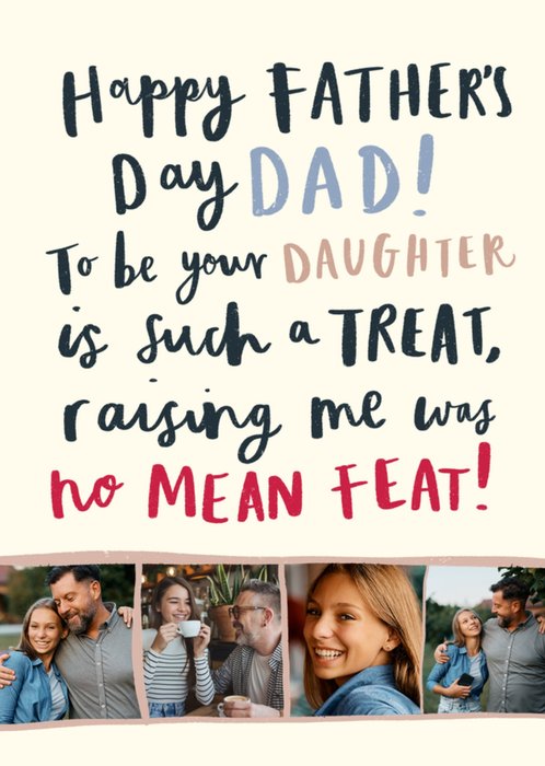 A fun and cheeky greeting card for Dad with playful typography in mixed colours and a strip of four rectangular photo slots along the bottom, perfect for showing off special daughter-and-dad moments.