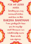 Front of card: Featuring a sentimental message encircled by colourful patterns. Text reads: "For my sister Maya sending you my warmest wishes and love on this Raksha Bandhan I am grateful to have you in my life and I treasure our relationship more than words can express.". 'For my sister Maya' and 'Raksha Bandhan' can be personalised!
