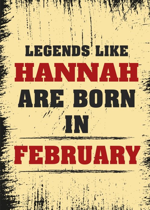 Front of card: February Birthday Card Red and black typography on a grunge background. Text reads: "Legends like Hannah are born in february". 'Hannah' can be personalised!