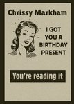 Front of card: Funny Retro Birthday Card Retro iIlustration of a laughing woman on a brown paper textured background. Text reads: "Chrissy Markham I got you a birthday present" and "you're reading it". 'Chrissy Markham' can be personalised!