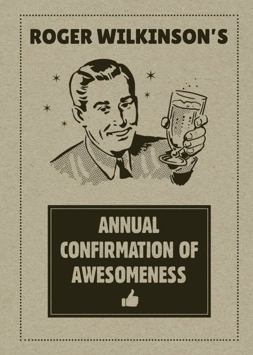 Front of card: Funny Retro Birthday Card Retro iIlustration of man raising a glass of beer on a brown paper textured background. Text reads: "Roger Wilkinson's annual confirmation of awesomeness". 'Roger Wilkinson's' can be personalised!