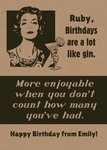 Front of card: Funny Retro Birthday Card Retro iIlustration of woman enjoying a glass of gin on a brown paper textured background. Text reads: "Ruby birthdays are alot like gin. More enjoyable when you don't count how many you've had. Happy birthday from Emily". 'Ruby' and 'Happy birthday from Emily' can be personalised!