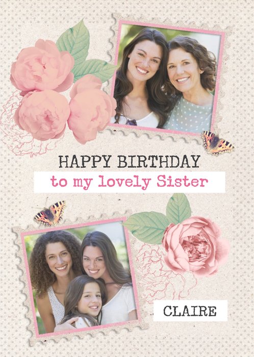 Roses And Butterflies Personalised Photo Upload Happy Birthday Card For Sister