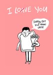 This playful card features a pink background with the phrase "I Loave You" humorously corrected from "loave" to "love," alongside a cartoon figure dressed as a slice of bread, holding flowers and apologetically saying, "Sorry, got the memo late," blending pun-filled wordplay with a lighthearted and quirky design.