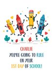 A colourful design featuring smiling, cartoon stationery leaping in celebration. The characters are surrounded by colourful leaves, and there is an empowering message with an editable name.