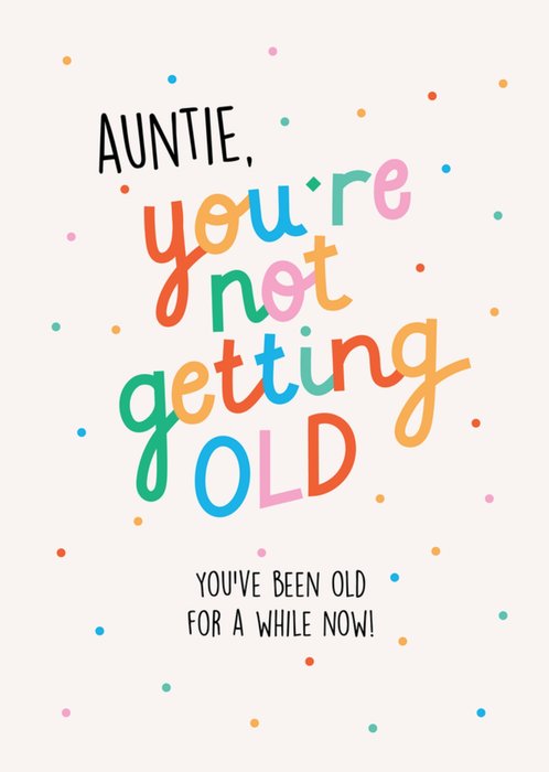 This greeting card design features playful text that reads “Auntie, you’re not getting old, you’ve been old for a while now!” in a mix of bold and colourful lettering, with the background scattered with vibrant, multicoloured polka dots for a cheerful and humorous effect.