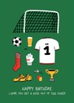 Featuring an illustration of football equipment including; football goal posts, a football, a pint of beer, socks, a goalie glove, a football jersey, football boots, a referee whistle, red and yellow cards and a trophy with white text below on a green-coloured background.