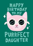 Featuring a cool, whimsical design on a dark green-coloured background. At the centre is an illustrated pink cat's head wearing hip, white sunglasses. Above and below the cat's head there is mint green hand-drawn text.