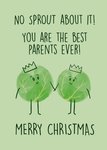 This light-hearted Christmas card features two hand-drawn cartoon Brussels sprouts wearing crowns, holding hands, with the playful message “No sprout about it! You are the best parents ever!” on a soft green background.