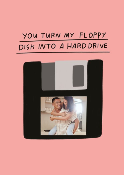 Featuring handwritten black text with a photo upload area inside a simple hand-drawn floppy disk on a pink-coloured background.