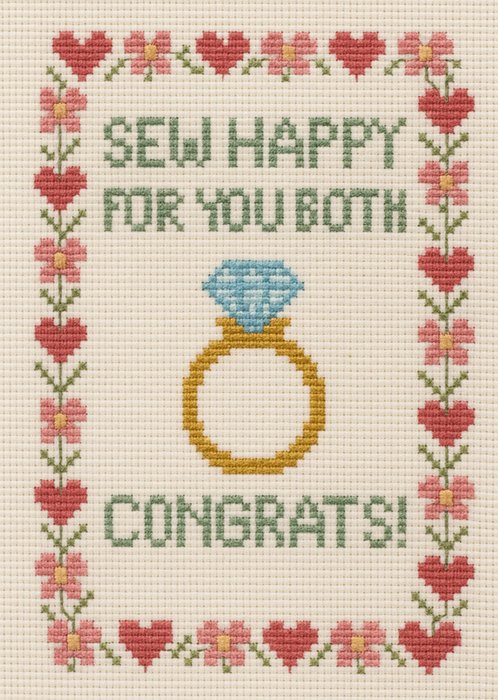 A stitched effect design featuring central text with a diamond ring surrounded by a heart and flower border on a cream background.